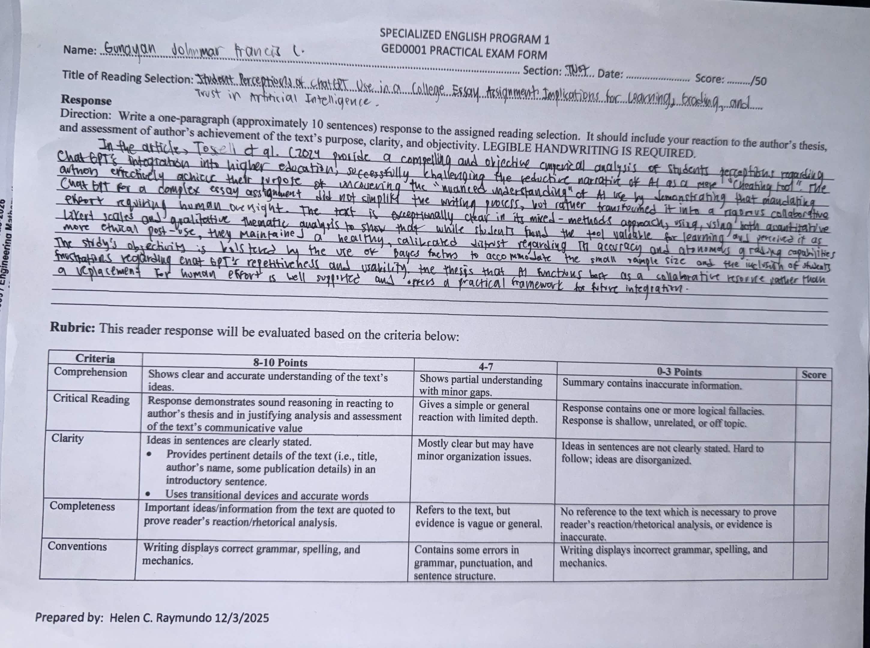 Student perception of chatgpt use in a college essay assignment: implications for learning, grading, and trust in artificial intelligence (Tossell et al., 2024)